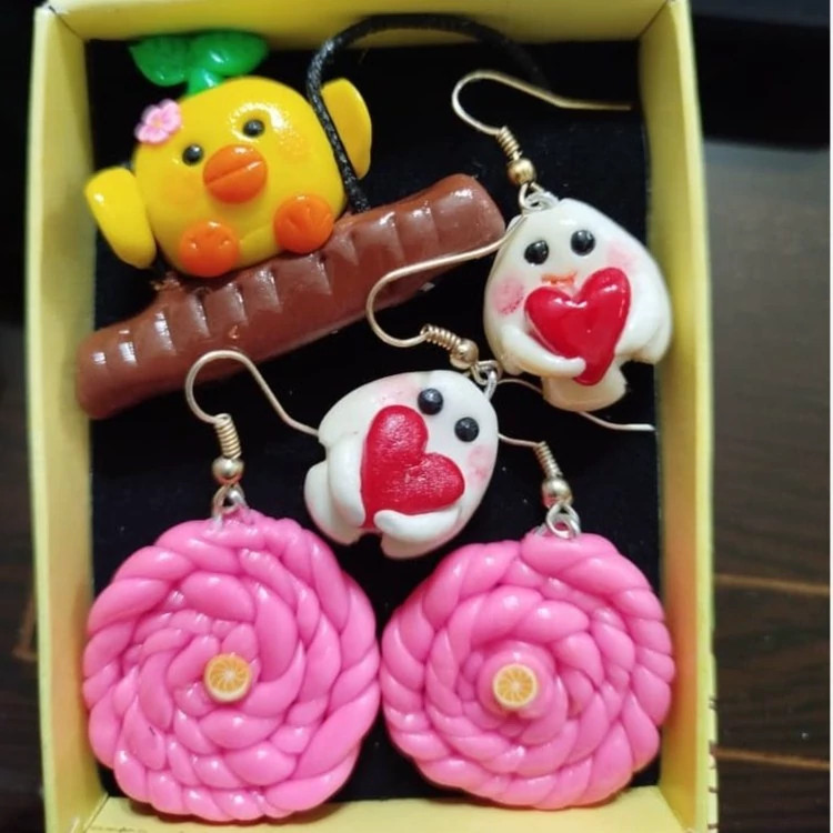 پک گوشواره روح . گوشواره بافت پیچ پیچی و آویز ماشین جوجه